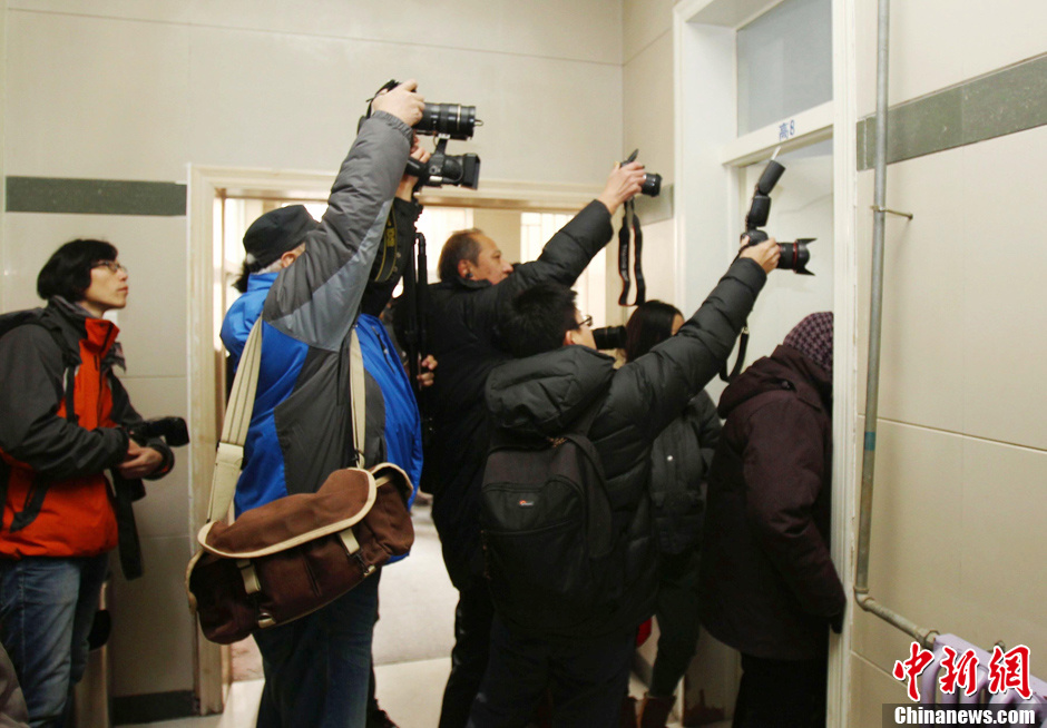 1月6日,河南兰考,上百名记者守候在袁厉害病房外,等候采访。当日,河南兰考弃婴收养者袁厉害正在医院里接受治疗。袁厉害的儿子杜鸣表示其母亲昨天晚上由于血压过高被送到医院。主治医师郭新凤介绍:袁厉害于今天凌晨0点35分左右来到医院,当时测血压是200、100毫米汞柱,当时病人头疼头晕,CT头部扫描发现没有较严重的问题。中新社发 王中举 摄