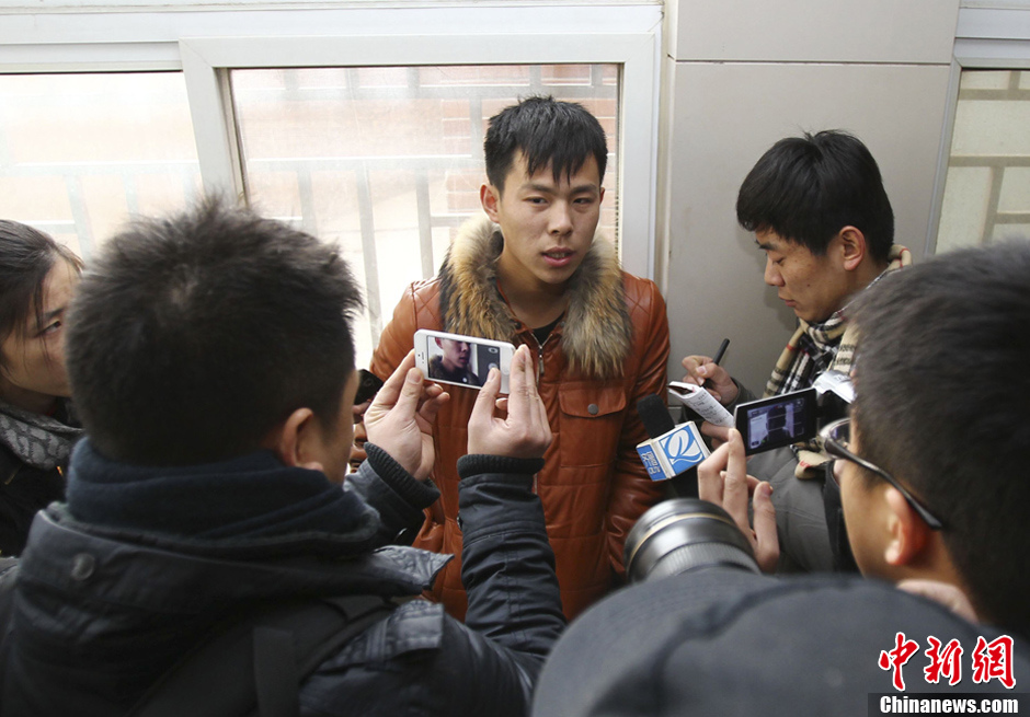 1月6日,河南兰考,上百名记者守候在袁厉害病房外,等候采访。当日,河南兰考弃婴收养者袁厉害正在医院里接受治疗。袁厉害的儿子杜鸣表示其母亲昨天晚上由于血压过高被送到医院。主治医师郭新凤介绍:袁厉害于今天凌晨0点35分左右来到医院,当时测血压是200、100毫米汞柱,当时病人头疼头晕,CT头部扫描发现没有较严重的问题。图为袁厉害小儿子讲述母亲住院经过。中新社发 王中举 摄