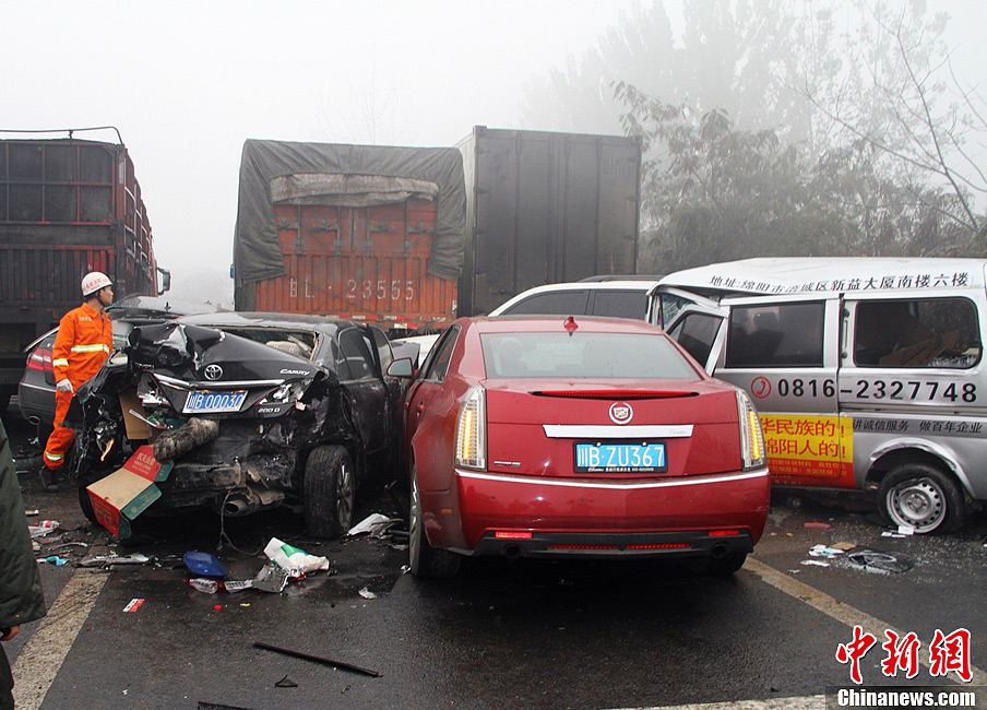 1月6日,四川遭遇今年首场大雾袭击,成(都)彭(州)高速因能见度不足50米,引发连环追尾交通事故,已知有5人受伤。图为连环车祸受损车辆中不乏奔驰、凯迪拉克等豪车。成小萱 摄