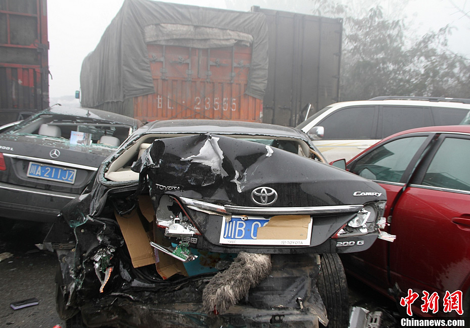 1月6日,四川遭遇今年首场大雾袭击,成(都)彭(州)高速因能见度不足50米,引发连环追尾交通事故,已知有5人受伤。图为受损严重的车辆。成小萱 摄