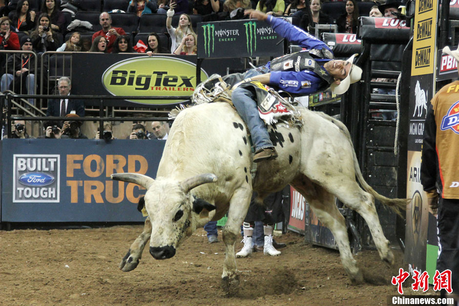 当地时间1月4日,美国纽约,2013专业骑牛大赛开幕。比赛全程紧张刺激,选手遭“蛮牛”各种甩飞,惨状接连不断。图片来源:东方IC 版权作品 请勿转载