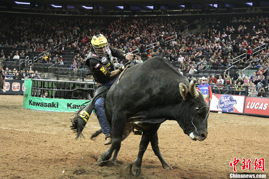 当地时间1月4日,美国纽约,2013专业骑牛大赛开幕。比赛全程紧张刺激,选手遭“蛮牛”各种甩飞,惨状接连不断。图片来源:东方IC 版权作品 请勿转载