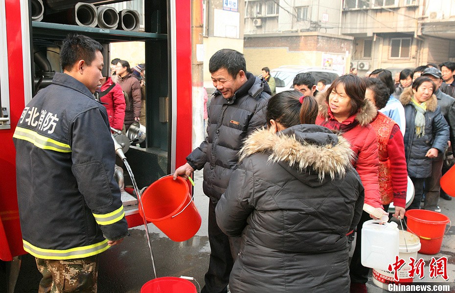 1月6日,邯郸市区西部用水告急,邯郸市消防支队再次抽调10辆消防水罐车往返市区西部12个居民小区为居民送水。截止当日下午14时,消防官兵为市民送水1255吨。由于漳河上游浊漳河,在山西境内发生了事故性污染物排放,使河北省邯郸市重要水源地岳城水库受到污染影响,导致该市突发大面积停水。翟羽佳 摄
