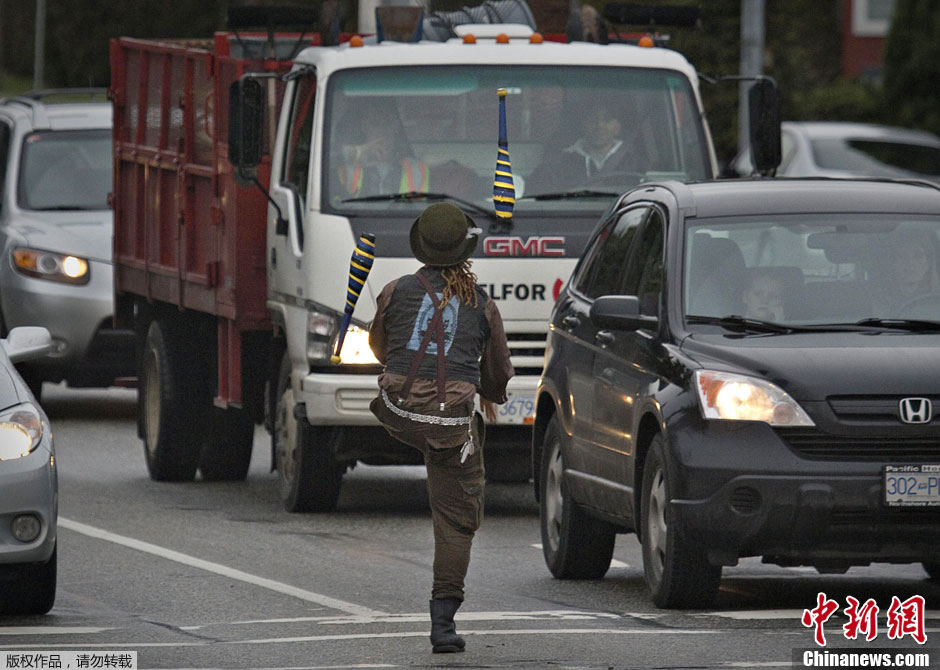 悠闲等红灯:加拿大街头艺人红灯线前表演杂耍