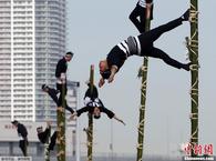 日本新年消防演习 消防员攀竹梯玩杂耍