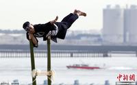 当地时间1月6日,日本东京举行新年消防演习,消防员攀上竹梯表演“杂耍”。