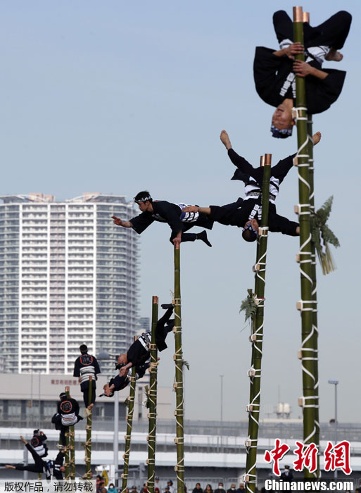 日本新年消防演习 消防员攀竹梯玩杂耍