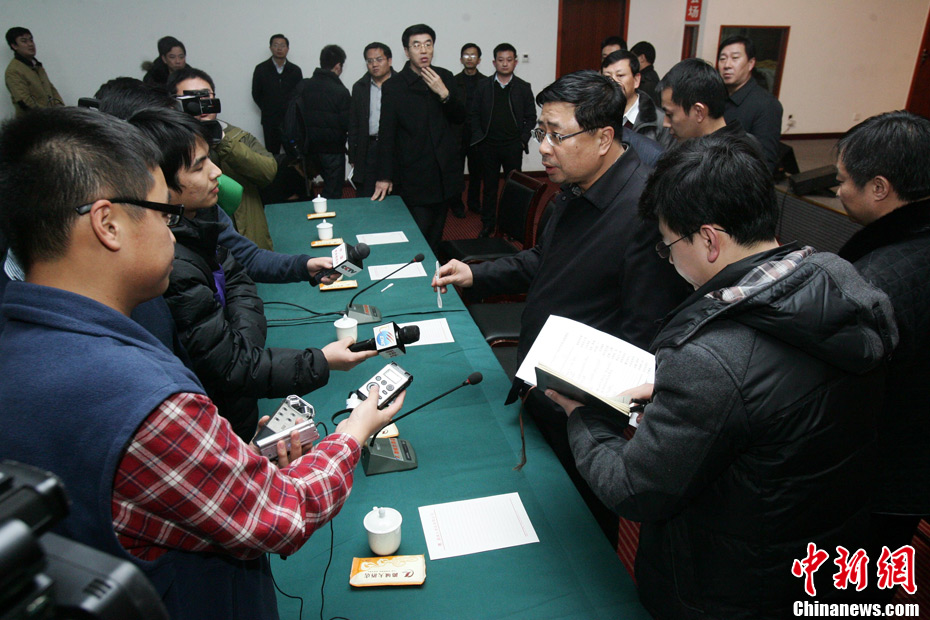 6日晚间,记者从山西长治苯胺泄漏事故应急指挥部召开新闻通气会上获悉,直接发生事故的山西天脊煤化工集团股份有限公司下属企业天脊方元公司总经理陈建温、安全生产副总经理任勇杰等4名直接责任人已被撤职处分。图为会后,来自中国各地媒体记者围堵山西省长治市市长张保,争相发问。张云 摄