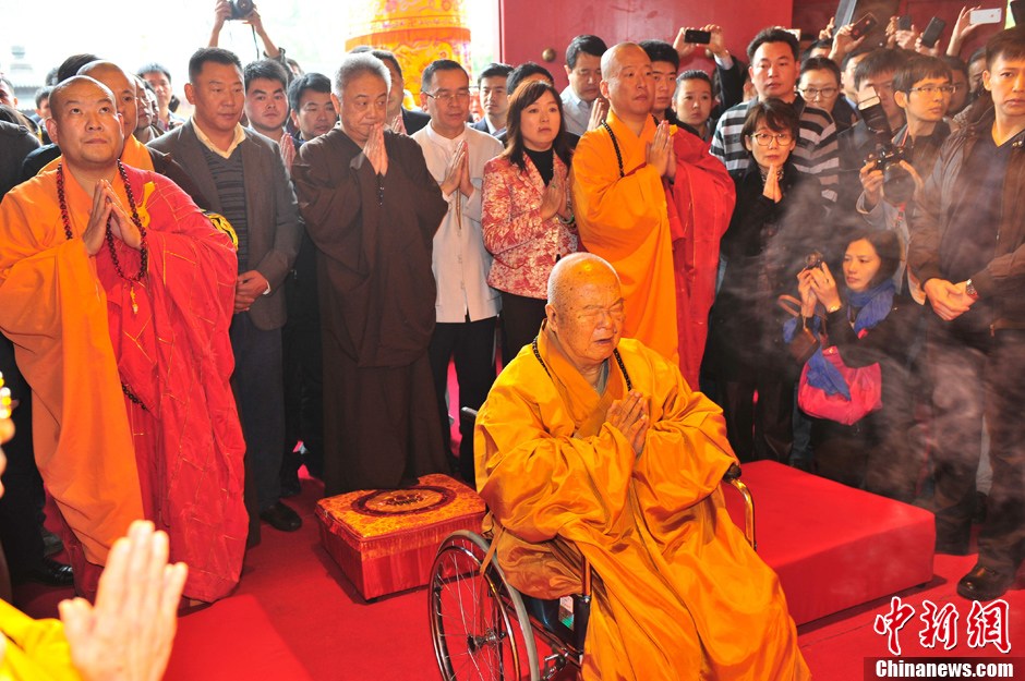 1月7日上午,台湾佛光山开山宗长星云大师在海南博鳌禅寺举行两岸和平祈福法会,并与北京灵光寺方丈、博鳌禅寺首座兼监院常藏大和尚等为万佛塔玉佛开光。同时,星云大师还为西殿禅修讲经堂揭牌、种和平树、撞和平钟、放和平鸽等。中新社发 骆云飞 摄