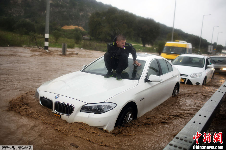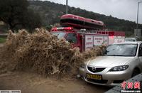 近日,连续的狂风和暴雨、暴雪天气袭击中东地区多个国家,造成多个地区洪水泛滥、交通受阻,并有人员死伤情况的报道。图为当地时间1月8日,以色列Qara Kfar遭遇洪水侵袭,交通受阻。