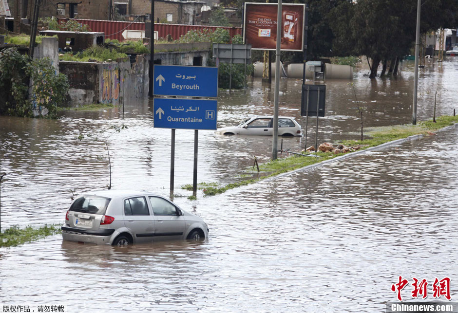 近日,连续的狂风和暴雨、暴雪天气袭击中东地区多个国家,造成多个地区洪水泛滥、交通受阻,并有人员死伤情况的报道。图为当地时间1月7日,黎巴嫩贝鲁特遭遇洪水侵袭,交通受阻。