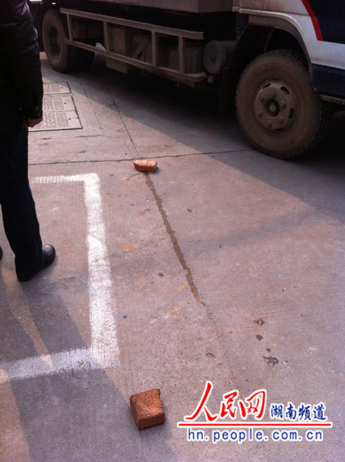 10日上午10点50分左右,长沙市晚报大道君逸山水酒店附近发生一起枪击案,一人面部中枪,一人被砖头砸中头部,生死暂时不明。图为散落在现场周围的板砖。图片来源:人民网