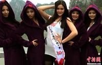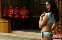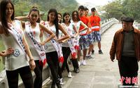 1月10日,广东肇庆受新一股冷空气影响,气温明显下降,正在当地参加第37届国际比基尼小姐大赛中国区总决赛的佳丽身着比基尼来到七星岩景区进行拍摄。中新社发 钱兴强 摄