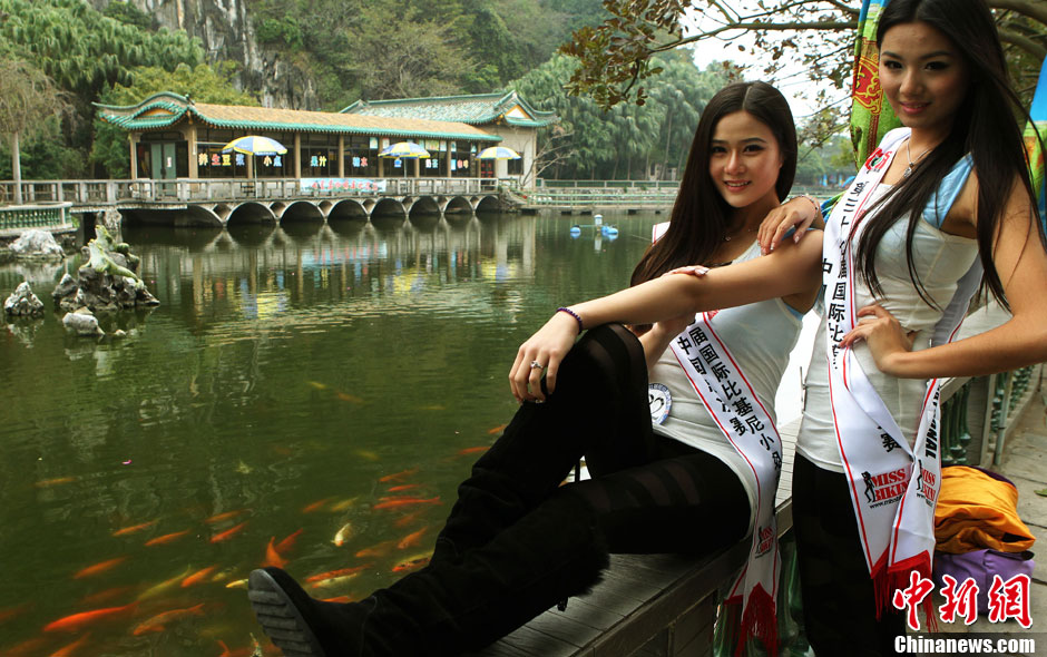 1月10日,广东肇庆受新一股冷空气影响,气温明显下降,正在当地参加第37届国际比基尼小姐大赛中国区总决赛的佳丽身着比基尼来到七星岩景区进行拍摄。中新社发 钱兴强 摄