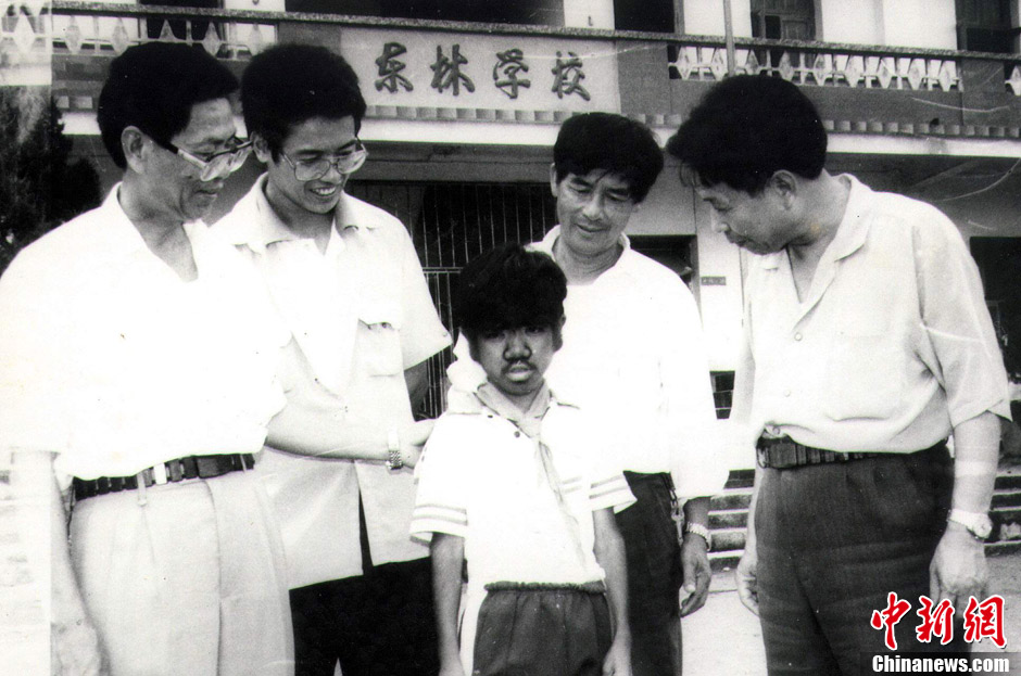“毛孩”陈其文的成长受到社会各界的广泛关心。图为1996年盘陀乡乡镇负责人到学校看望陈其文。蓝智伟、姚鸣声、张文艺、林巧雪 文/图