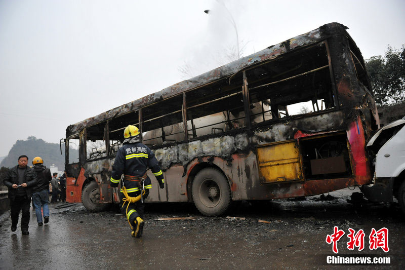 2013年1月10日下午17时许,贵阳五里冲路,进城方向蔡家关路段发生一起交通事故,18车碰撞追尾,4车燃烧起火,伤亡情况不明。燃烧的4辆车分别是水泥搅拌车、公交车、面包车和三轮车。现场一片残渣,烧毁的四辆车挨在一起,水泥搅拌车车头完全烧毁,公交车仅剩一个空架,玻璃全部烧炸了,面包车面目全非,最惨的是一辆三轮车,被烧得仅剩一个车架。截止当晚18点35分,二大队交警仍在紧急救援。起火原因不明,事故现场仍在进一步勘验当中。图片来源:CFP视觉中国