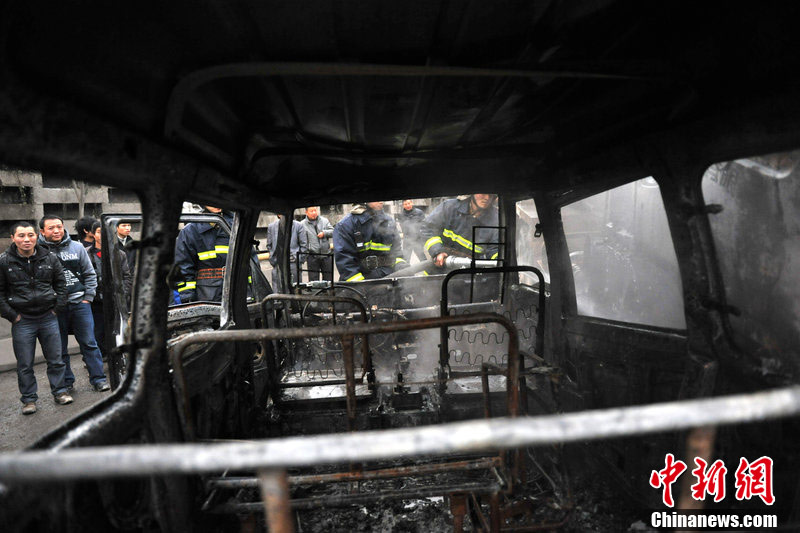 2013年1月10日下午17时许,贵阳五里冲路,进城方向蔡家关路段发生一起交通事故,18车碰撞追尾,4车燃烧起火,伤亡情况不明。燃烧的4辆车分别是水泥搅拌车、公交车、面包车和三轮车。现场一片残渣,烧毁的四辆车挨在一起,水泥搅拌车车头完全烧毁,公交车仅剩一个空架,玻璃全部烧炸了,面包车面目全非,最惨的是一辆三轮车,被烧得仅剩一个车架。截止当晚18点35分,二大队交警仍在紧急救援。起火原因不明,事故现场仍在进一步勘验当中。图片来源:CFP视觉中国
