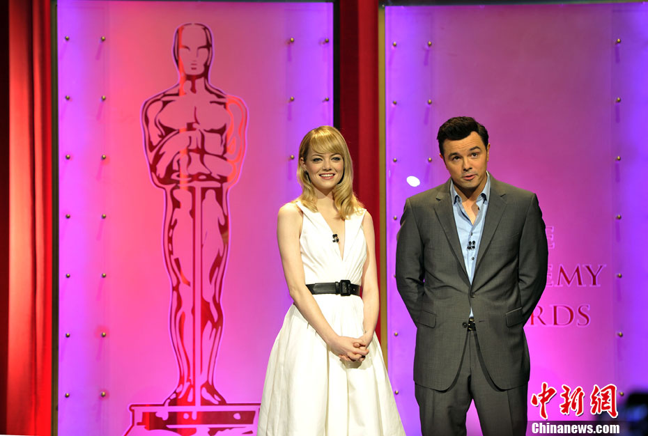 当地时间1月10日清晨,第85届奥斯卡提名名单在好莱坞揭晓,斯皮尔伯格执导的《林肯》以12项提名领跑,李安导演的《少年派的奇幻漂流》收获11项提名紧随其后。第85届奥斯卡奖主持人、著名影星艾玛-斯通与喜剧导演塞斯-麦克法兰宣布当天的各项提名。中新社发 毛建军 摄