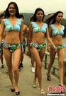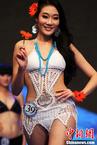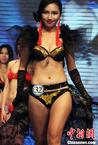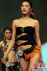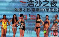 1月10日晚,正在广东肇庆参加第37届国际比基尼小姐大赛中国区总决赛的佳丽以及首届沙滩先生选手,在浩沙之夜劲爆才艺、潮爆DIY单项比赛上一展风采。图为参赛选手身穿自己设计的创意泳装展示。中新社发 钱兴强 摄
