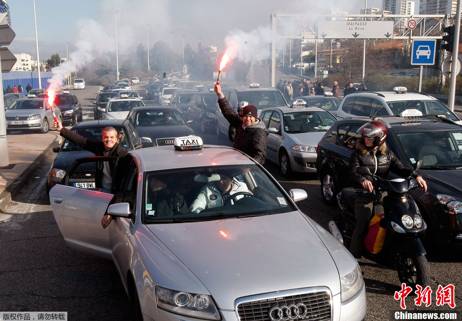 当地时间1月10日,法国巴黎、里昂、南特、第戎、波尔多、图卢兹等主要城市爆发了大规模的出租车司机罢工示威。共有超过55000名出租车司机参与了罢工示威,他们在部分主干道上组成车队封锁道路,造成了不同程度的交通堵塞。据悉,此次出租司机罢工是为了抗议有关运载病人的一项新措施。目前法国运载病人的业务由签约的救护车或出租汽车共同承担,但这项新措施规定,将把运载病人的业务招标。组织这次罢工的出租汽车司机联合会担心独立经营的出租汽车司机将在招标中处于不利地位,以致于被排除在这项业务之外。