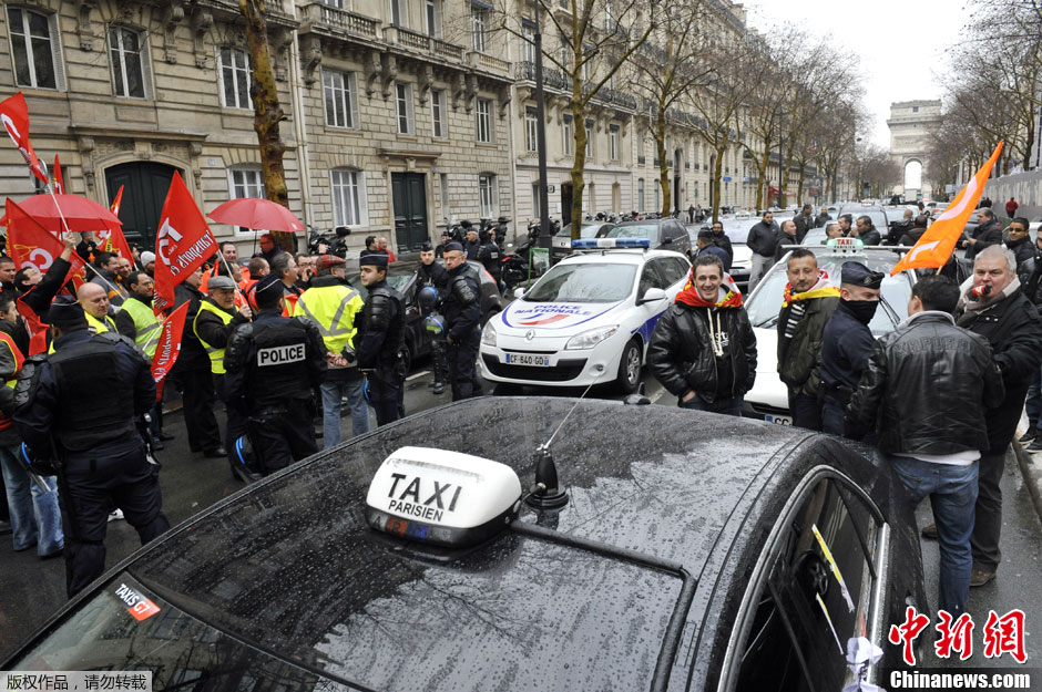 当地时间1月10日,法国巴黎、里昂、南特、第戎、波尔多、图卢兹等主要城市爆发了大规模的出租车司机罢工示威。共有超过55000名出租车司机参与了罢工示威,他们在部分主干道上组成车队封锁道路,造成了不同程度的交通堵塞。