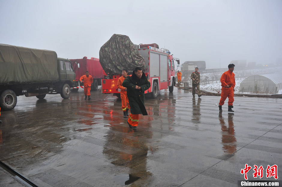 1月11日,云南昭通镇雄县果珠乡高坡村赵家沟发生山体滑坡事故,已致22死2伤。图为云南公安消防总队救援人员正冒雪赶赴事故现场。任东 摄