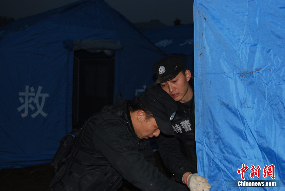 云南镇雄:警方为受灾民众搭建救灾帐篷