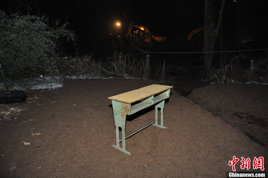 1月12日,云南镇雄滑坡事故的第一个夜晚,救援仍在继续。图为一个课桌静静的立在废墟上,滑坡事故中多名儿童因放假在家未能幸免。任东 摄
