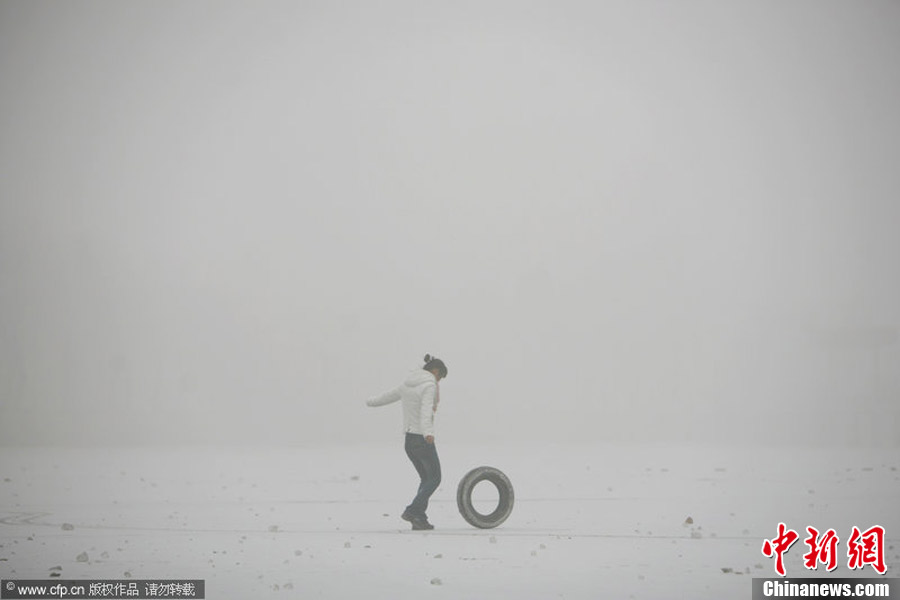 1月12日,浓雾封锁河北已进入第9天,雾情丝毫未退且正升级。自2013年1月4日开始,河北5个城市空气质量上升到5级重度污染以上水平。图为1月11日,河北省石家庄市,水上公园一位女子在冰面上玩耍。贺志泉 摄 图片来源:CFP视觉中国