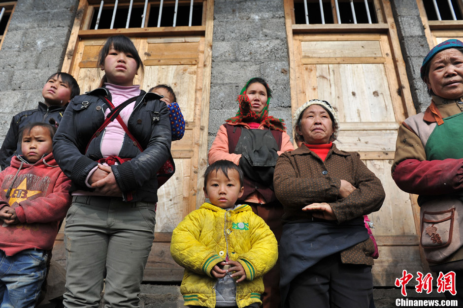 1月12日,发生在镇雄县果珠乡高坡村赵家沟村民组山体滑坡事故中,被埋的14户46人已确认全部遇难,46具遗体已全部找到。图为守在事故现场等待亲人消息的村民。任东 摄
