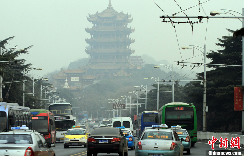 1月12日,武汉持续多日的雾霾天仍在持续,武汉城区PM2.5指数在300以上,达到6级重度污染级别。中央气象台12日继续发布大雾蓝色预警:河北中南部、天津南部、山东北部和西部、河南东部、苏皖中北部、浙江西北部、湖北东南部、四川盆地等地的部分地区有能见度不足1000米的雾,局地能见度不足200米。图为黄鹤楼几乎被雾霾淹没。中新社发 张畅 摄