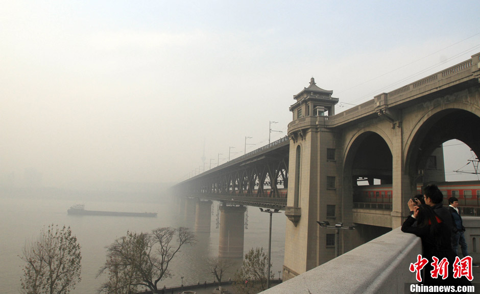 1月12日,武汉持续多日的雾霾天仍在持续,武汉城区PM2.5指数在300以上,达到6级重度污染级别。中央气象台12日继续发布大雾蓝色预警:河北中南部、天津南部、山东北部和西部、河南东部、苏皖中北部、浙江西北部、湖北东南部、四川盆地等地的部分地区有能见度不足1000米的雾,局地能见度不足200米。图为雾霾笼罩着武汉长江大桥。中新社发 张畅 摄