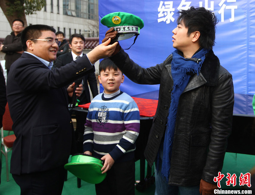 1月12日下午,头顶绿帽、别着“好人”标牌,陈光标在江苏南京向民众免费发放千辆自行车。中国著名钢琴家郎朗也来到现场,他弹奏了一曲钢琴曲,称自己在2008年也开始做公益活动,并将把500张南京演出票捐给观众。陈光标是大陆颇受争议的慈善家,其“高调”行善方式长期以来惹人关注。图为陈光标欲给郎朗戴上象征绿色出行的“绿帽子”,被郎朗婉拒绝,朗朗笑称“拿着就行”。泱波 摄