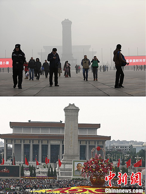 北京环保监测中心数据显示,截至12日18时,北京城区空气质量已达严重污染级别,市区PM2.5浓度非常高,已濒临“爆表”。截至晚上23时,北京西直门北、南三环、奥体中心等监测点PM10实时浓度突破900,西直门北监测点最高达993微克/立方米。北京环境监测中心专家表示,从污染形势预报的分析结果看,此次影响北京市的重污染过程在下周一之前不会发生明显改善。上图为2013年1月12日拍摄的游客在雾霾笼罩的天安门广场游玩。中新社发 刘关关 摄。下图为2012年10月3日,北京天安门广场游客众多。中新社发 张浩 摄