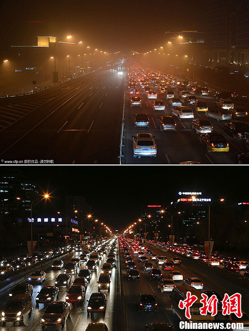 北京环保监测中心数据显示,截至12日18时,北京城区空气质量已达严重污染级别,市区PM2.5浓度非常高,已濒临“爆表”。截至晚上23时,北京西直门北、南三环、奥体中心等监测点PM10实时浓度突破900,西直门北监测点最高达993微克/立方米。北京环境监测中心专家表示,从污染形势预报的分析结果看,此次影响北京市的重污染过程在下周一之前不会发生明显改善。上图为2013年1月12日拍摄的大雾笼罩下的北京交通。赵思衡 摄 图片来源:CFP视觉中国。下图为2012年12月24日拍摄的北京西二环。中新社发 张浩 摄