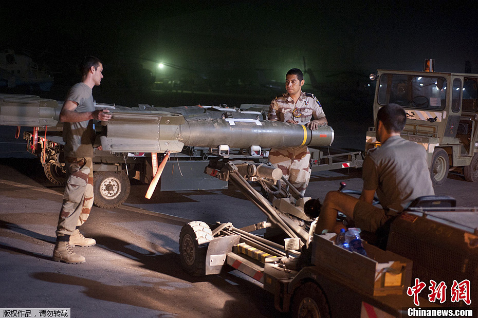 当地时间1月12日,马里军方称,法国军队在对马里北部重镇科纳发动的空袭中打死了100多名武装分子。据马里军队的一名军官对媒体说,目前马里政府军已经完全占领科纳镇,他们和法国军队至少打死了上百名武装分子。马里总统府发言人当天晚上在巴马科表示,交火中马里军队有11人死亡、60多人受伤。图为法国空军地勤人员正在为飞机挂弹。