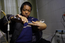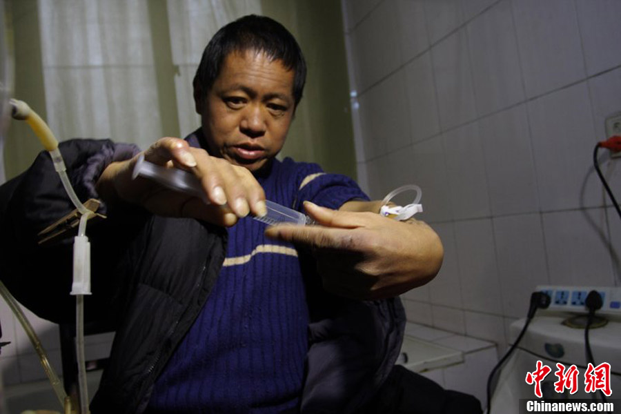 13年前,终末期肾衰患者胡颂文用日常厨具及简单仪器自制了一台“血透机”,将生命延长至今。一次自助透析的费用不到60元,仅为医院费用的八分之一。朱吉鹏 摄 图片来源:CFP视觉中国