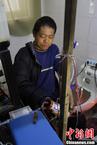 1月16日,江苏海安,终末期肾衰患者胡颂文通过用日常厨具及简单仪器自制的一台血透机进行自助透析。