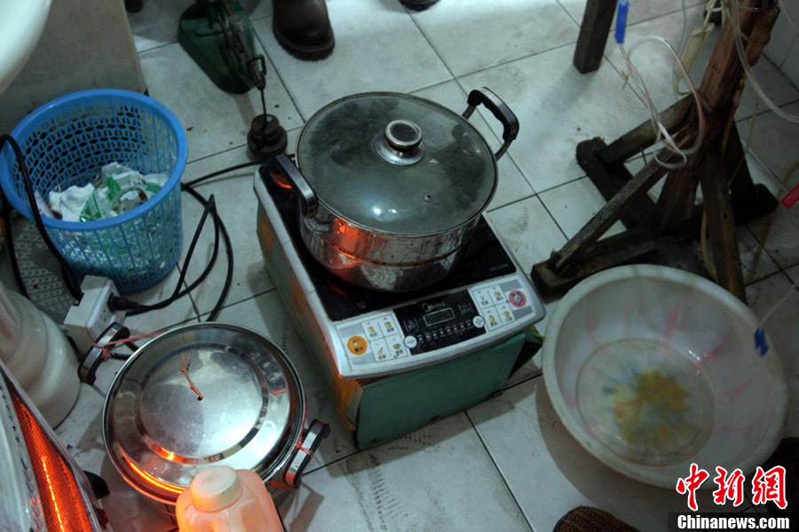 1月16日,江苏海安,终末期肾衰患者胡颂文通过用日常厨具及简单仪器自制的一台血透机进行自助透析。朱吉鹏 摄 图片来源:CFP视觉中国