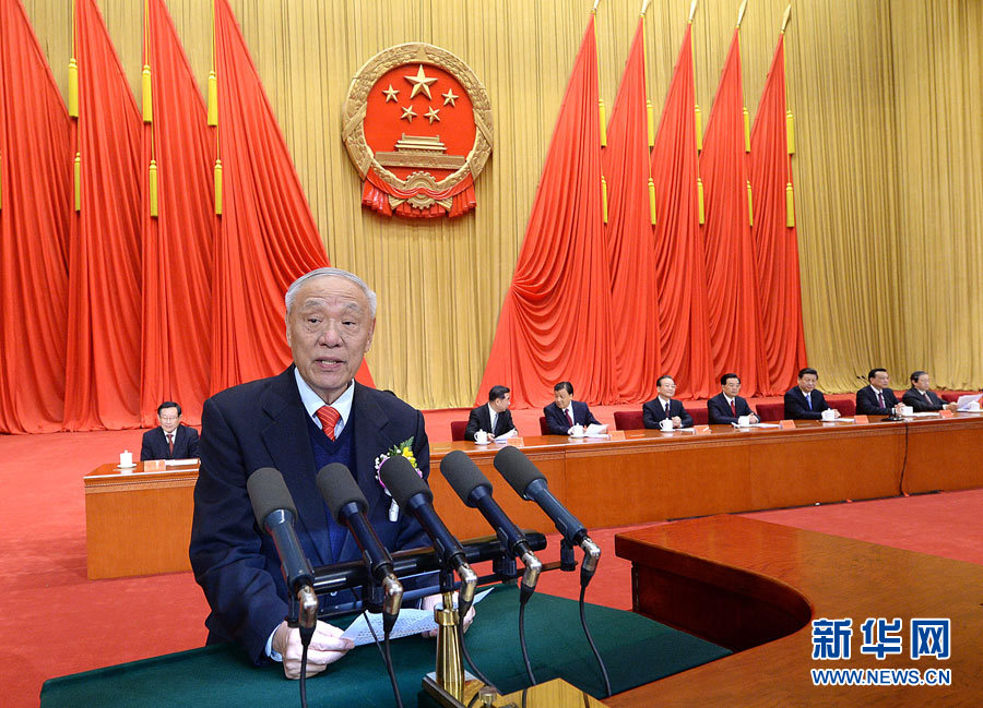 1月18日,中共中央、国务院在北京人民大会堂隆重举行国家科学技术奖励大会。胡锦涛、习近平、温家宝、李克强、刘云山出席大会并为获奖代表颁奖。这是2012年度国家最高科学技术奖获得者王小谟院士在会上发言。刘建生摄 图片来源:新华网