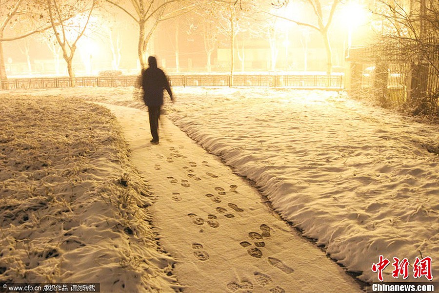 2013年1月20日,中央气象台预计,未来三天我国仍将持续大范围雨雪天气,北方地区以降雪为主,其中新疆北部、山东半岛东部等地的部分地区有中到大雪,淮河以南地区则以降雨为主。此次雨雪过程对改善空气质量非常有利,但需注意对交通产生的不利影响。图为河南省郑州市,市民踏雪出行。余洪恩 摄 图片来源:CFP视觉中国