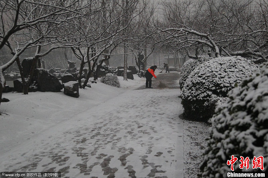 2013年1月20日,中央气象台预计,未来三天我国仍将持续大范围雨雪天气,北方地区以降雪为主,其中新疆北部、山东半岛东部等地的部分地区有中到大雪,淮河以南地区则以降雨为主。此次雨雪过程对改善空气质量非常有利,但需注意对交通产生的不利影响。图为河南省郑州市,环卫工人正在清扫积雪。余洪恩 摄 图片来源:CFP视觉中国