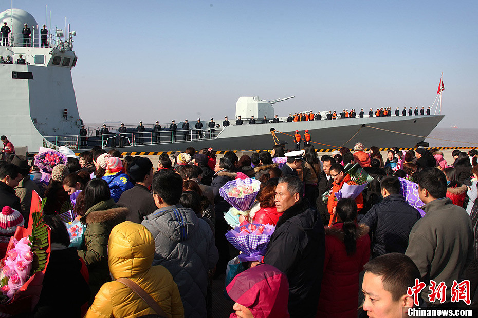 1月19日,历时201天,航程12449海里,在圆满完成亚丁湾、索马里海域护航任务以及访问澳大利亚、越南两国后,中国海军第十二批护航编队顺利返回浙江舟山某军港。中新社发 踞振华 摄