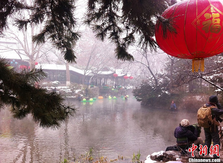 1月19日夜间的一场大雪,让泉城济南银装素裹,一片北国风光,素有天下第一泉的济南趵突泉云蒸雾腾,吸引了众多游客。图为趵突泉员工冒雪在泉水中布景,迎接新年来临。中新社发 胡洪林 摄