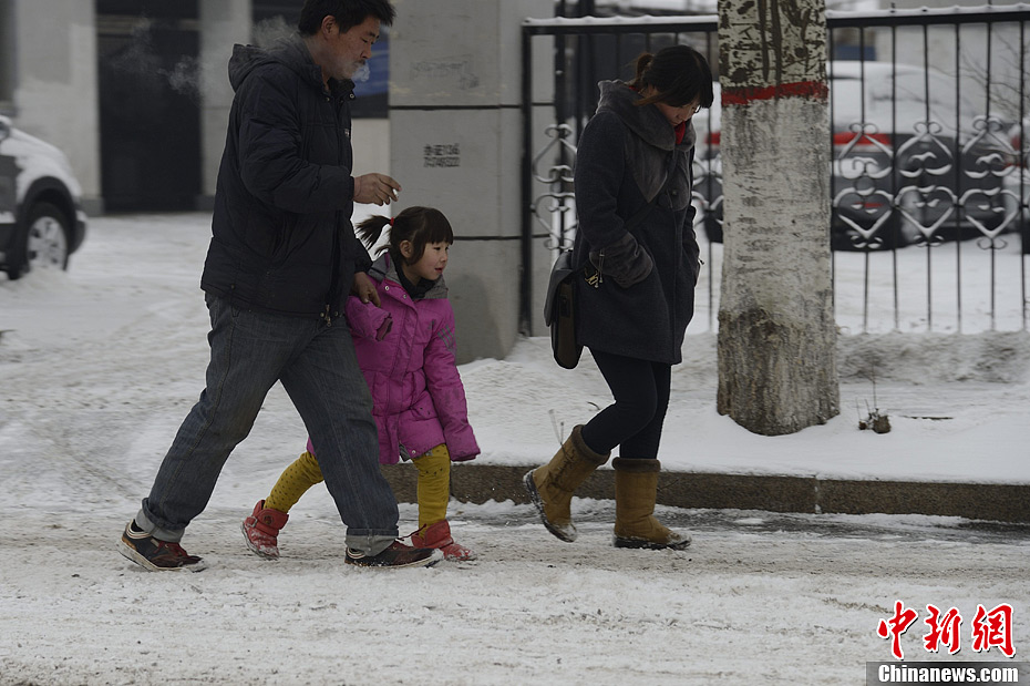 1月20日,呼和浩特再次降雪,市内出现雪雾,部分路段化成雪泥,市民出行受阻。中新社发 刘文华 摄