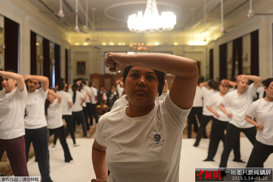 周四,印度新德里,帝国饭店(Imperial Hotel)的女性员工正在参加由警察主持的一个防身术课程。