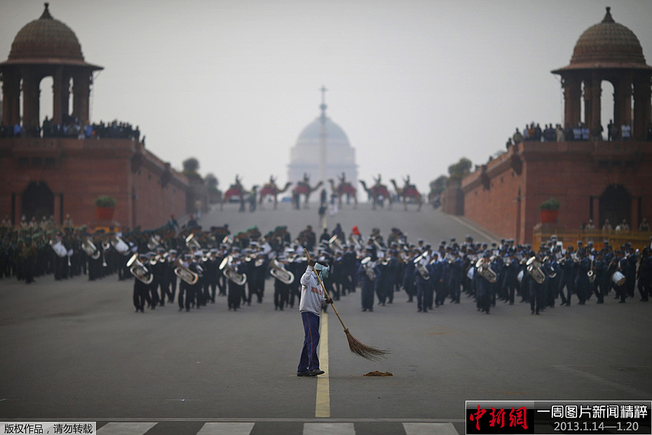 周四,印度新德里,一名工人正在清扫大街。不远处是正在为即将到来的阅兵式进行排练的军乐队。
