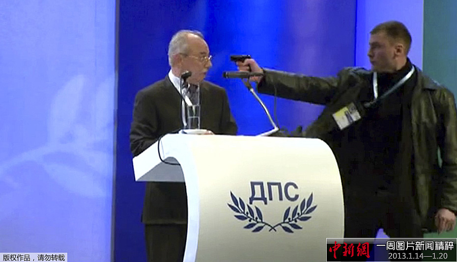 周五,保加利亚索非亚,保加利亚反对党土耳其族“争取权利与自由运动” 党领导人Ahmed Dogan举行党部会议,遭不明身份男子袭击。Ahmed Dogan并没有受伤。该袭击者用枪指着Ahmed Dogan,但是没有来得及开火。安保人员同袭击者扭打在一起,Ahmed Dogan被保镖按在地上进行保护。