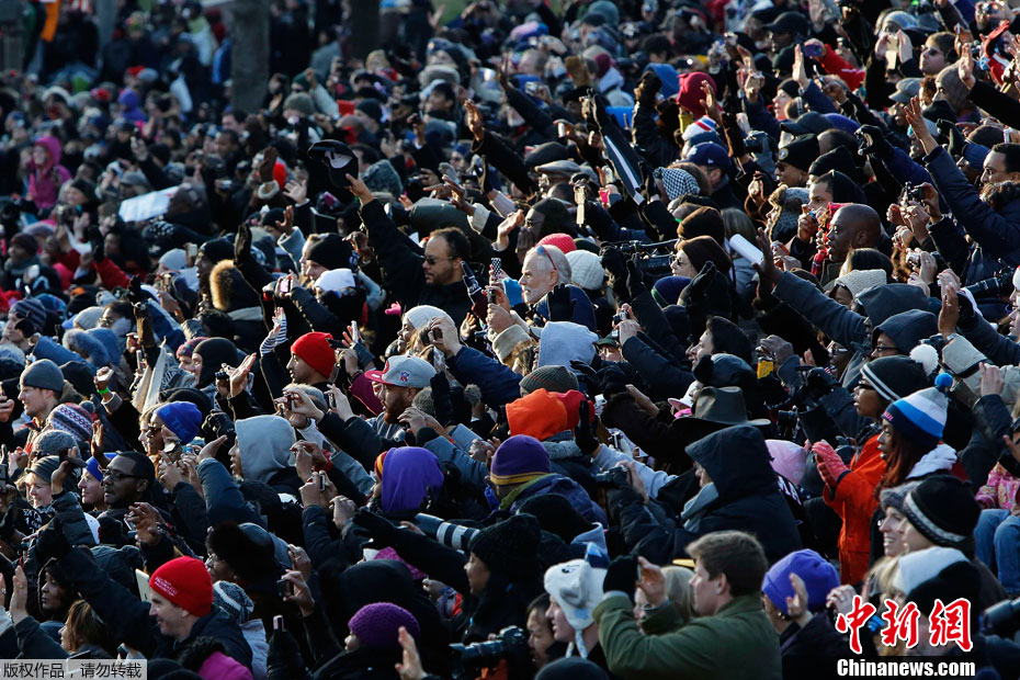 1月21日,美国连任总统奥巴马在华盛顿国会山举行公开宣誓就职仪式。图为参加仪式的民众们。