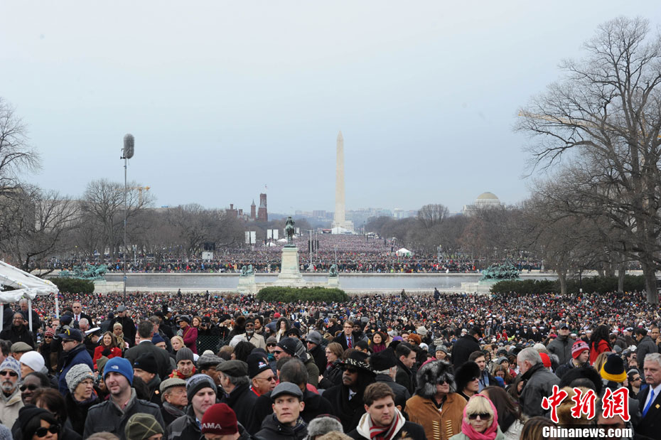 面对数十万热情的观众,美国2012年大选当选总统奥巴马21日在美国国会山宣誓就任美国第44任第57届总统。 图为当日约60至80万美国人到场观看就职典礼,将华盛顿国家广场挤得水泄不通。中新社发 吴庆才 摄